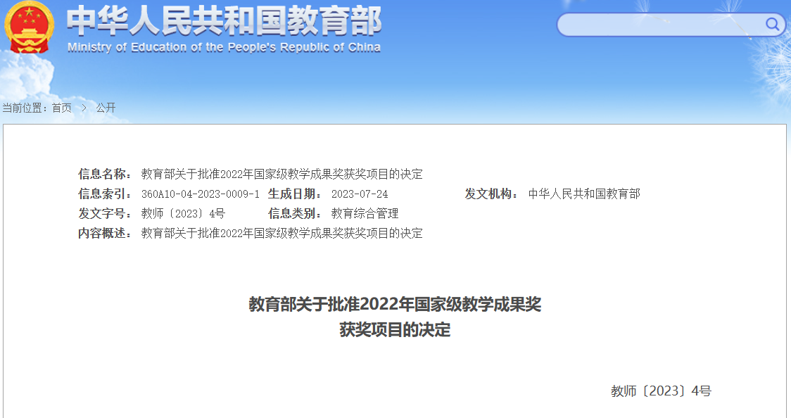 2023年7月21日,《教育部关于批准2022年国家级教学成果奖获奖项目的决定》(教师〔2023〕4号)正式发布。在本次国家级教学成果评选中,我院荣获国家级教学成果奖二等奖1项,参与一等奖和二等奖各1项目,取得了重大成绩。