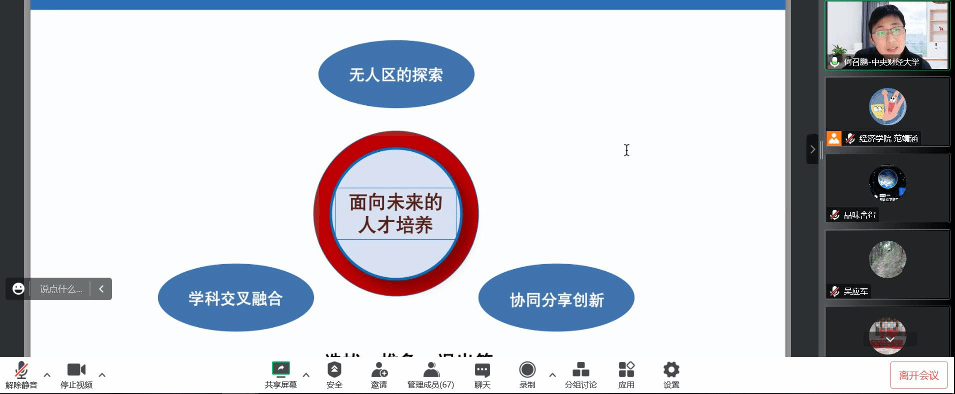 最后,何召鹏教授结合培养方案介绍了中央财经大学经济学拔尖人才培养的课程体系建设,并就如何提高学生专业知识水平及学术能力发表见解。何教授指出:数字经济拔尖人才的培养是面向世界的,其培养模式和课程体系建设依然需要探索完善。