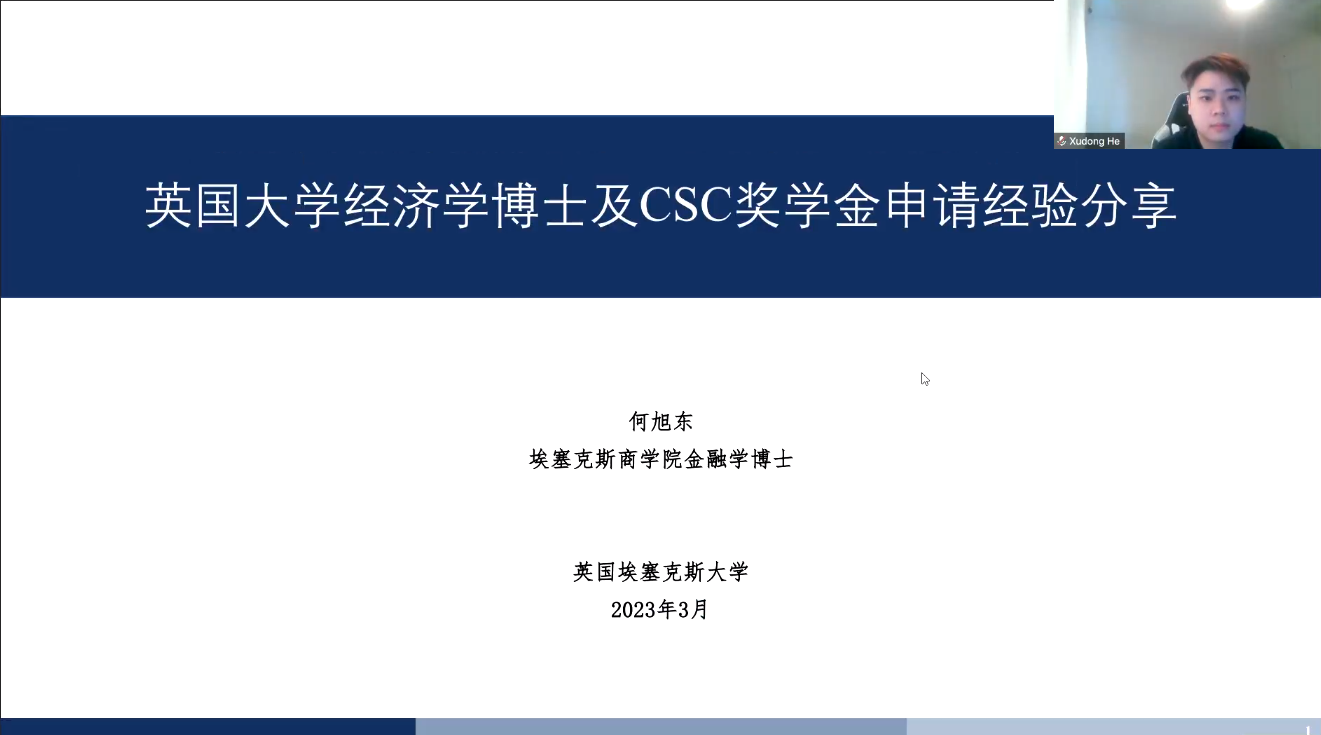 2023年3月21日,经济学院公派出国留学分享会在线上顺利举行。本次公派出国留学分享会邀请到了就读于英国埃塞克斯大学的何旭东博士和永利3044集团官网经济学院赴新加坡国立大学的联合培养博士廖健伶为大家进行公派出国留学的相关介绍和经验分享。会议由经济学院副院长邹红教授主持