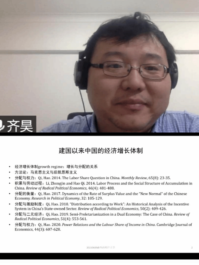 6月9日晚,中特中心纪念中国共产党建党百年经济理论与实践系列讲座第六讲在腾讯会议平台顺利举行。本次讲座由中国人民大学经济学院齐昊副教授主讲,政治经济学研究所李怡乐副教授主持。我院及兄弟院校多位教师、研究生在线聆听了本次讲座。
