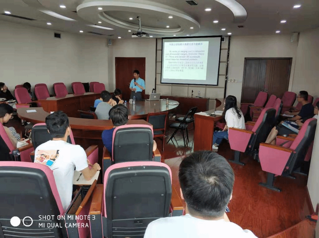 2019年6月10日上午,第61期经济学院学术创新系列讲座在格致楼918会议室成功举行。此次讲座邀请了加拿大萨省大学经济系终身教授赵进钢作了题为“合作博弈、科斯定理与交易费用度量”的专题学术报告,讲座由袁正教授主持。会前,经济学院院长易敏利、分党委书记兰敏,副院长邹红和赵进钢教授举行亲切会谈,双方就“2+2”合作项目进行了广泛深入的交流,期望加快“2+2”合作项目的推进,也探索其他短期合作的可能性。经济学院西方经济学学生及其他专业部分师生参与了此次讲座。